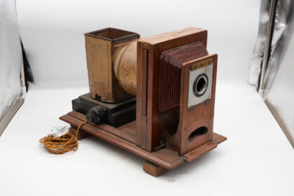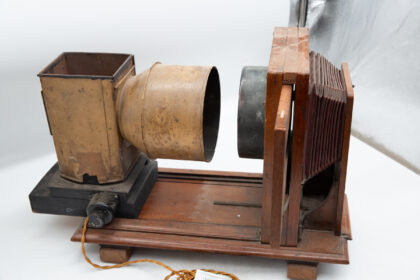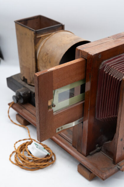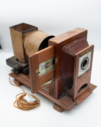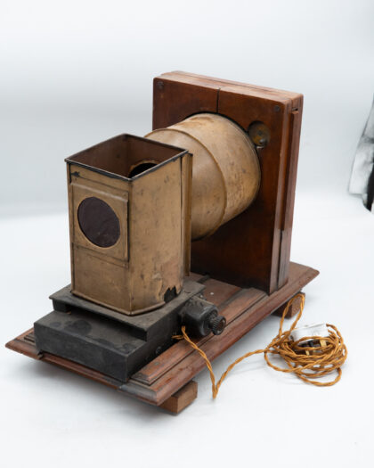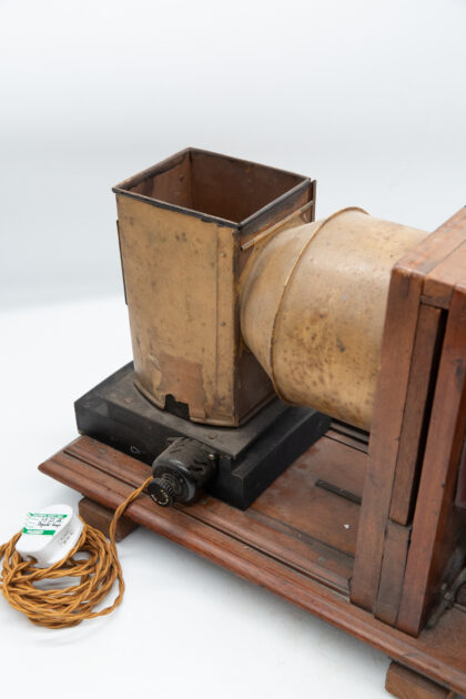 An antique projector which has been turned into a lamp here in the On the Square Workshop.