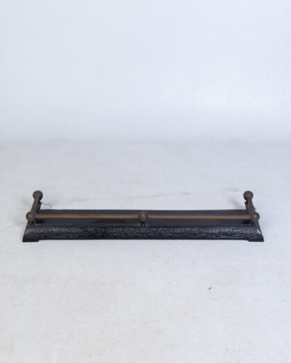 This is an antique cast iron fireplace fender or kerb, likely dating from the early 20th century. It features a black painted cast iron base with an ornate floral pattern. A brass rail runs along the top supported by decorative finials. The item is in good condition for its age, with some wear and minor surface rust consistent with use. This piece would add a touch of vintage charm to any fireplace.