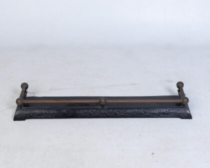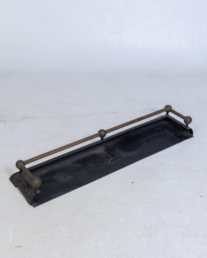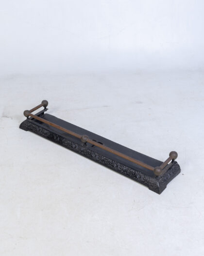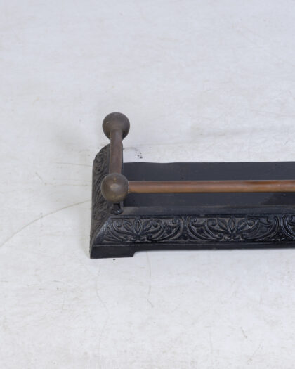 Antique cast iron fireplace fender with ornate floral design and brass rail. Good condition, early 20th century. Adds vintage charm.