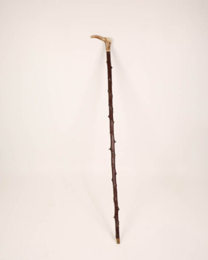 This is an antique walking stick, likely dating from the early 20th century. The handle is crafted from stag horn, featuring natural ridges and curves and a pale colour. The wooden shaft has a dark brown finish and is adorned with branch detail, giving it a rustic aesthetic. The wood has some scuffs and wear consistent with age and use, adding to its character. This would make an ideal accessory for someone who appreciates the charm of vintage items.