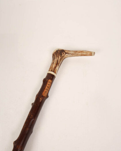 Antique walking stick with a carved stag horn handle and branch detail. The wooden shaft has some wear, consistent with age and use. Unique vintage piece.