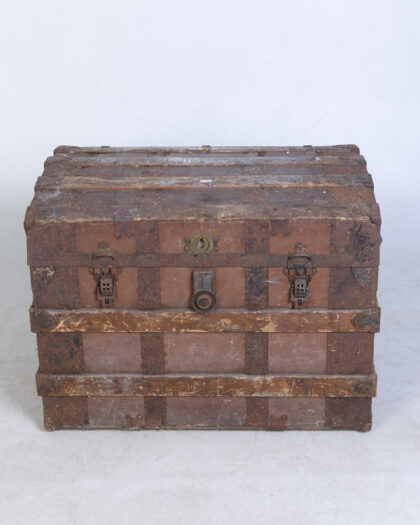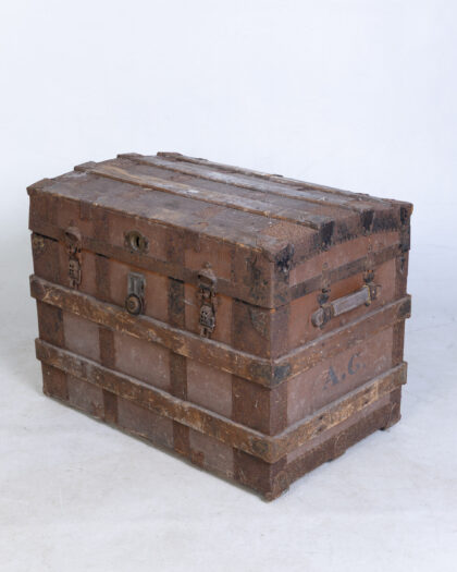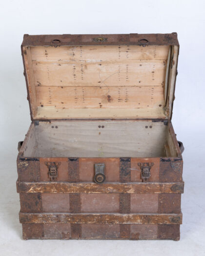 Authentic antique wooden steamer trunk with metal hardware. Ideal for vintage storage and a unique decorative accent. Features historic charm and wear consistent with its late 19th/early 20th-century origin.