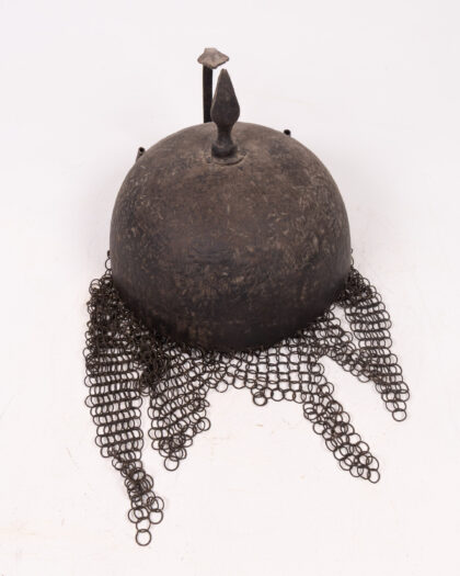 This is an antique Kulah Khud helmet, a type of helmet originating from Persia and used throughout India, Turkey, and surrounding regions. The helmet is constructed of steel and has a hemispherical shape. It features a decorative spike at the top and a chainmail aventail to protect the neck and upper shoulders. The helmet is black/grey in colour. This helmet is a unique and fascinating piece of military history.