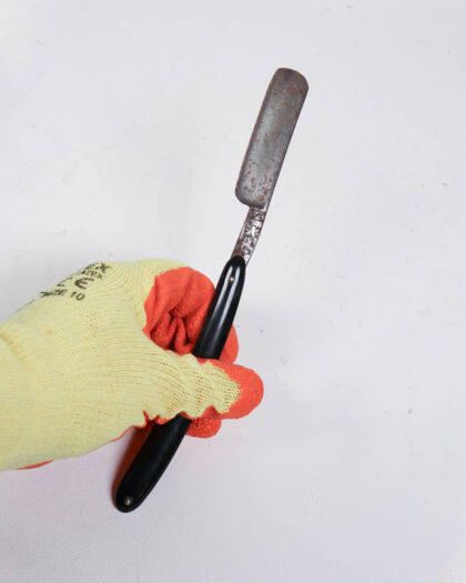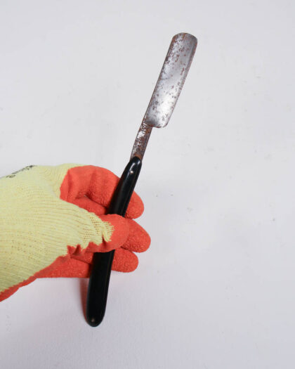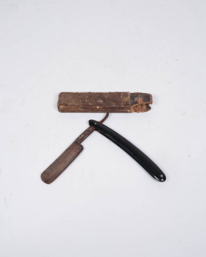 This is an antique straight razor featuring a black plastic handle and a steel blade. The blade shows considerable age with some rust and patina. The razor comes with its original cardboard box, which is worn but intact. This type of razor was commonly used for shaving before the advent of modern razors. Displaying this razor is a great way to add a touch of vintage charm to a bathroom shelf or shaving collection.