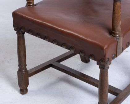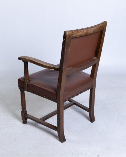 This is an antique armchair with a brown leather seat and back, and a dark wood frame. The chair features a simple design with straight lines and a slightly curved back. The leather is adorned with decorative tacks or studs around the edges, adding a touch of rustic charm. The chair's legs have a turned design, common in antique furniture. The wooden frame shows signs of age and wear, with some scuffs and colour variations, which contribute to its character. The seat appears to be well-worn, suggesting it has been used and enjoyed over time. The chair would look well in various settings, from a dining room to a study. Overall, the chair is in good vintage condition, with wear consistent with its age. This chair can be used functionally or as a decorative statement piece.