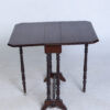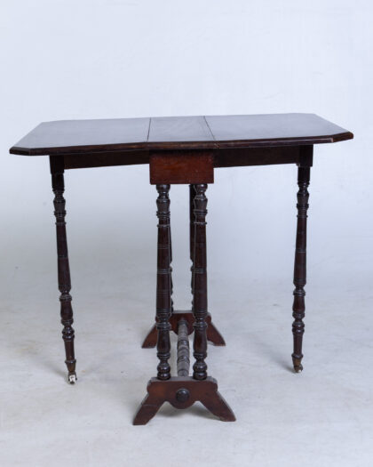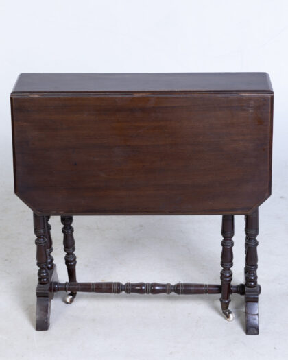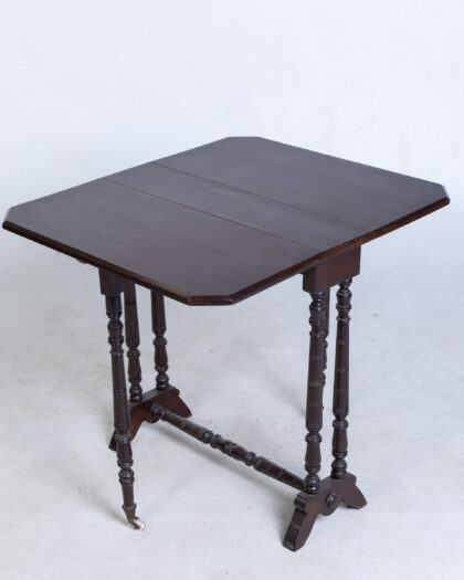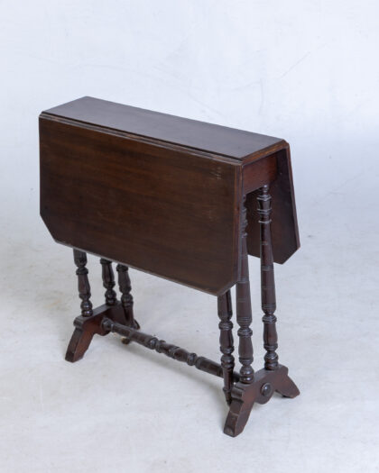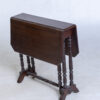 Versatile brown wood drop leaf table featuring elegant turned legs and a practical stretcher base. Functions perfectly as a coffee or side table.