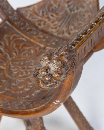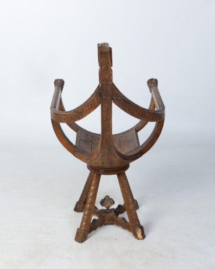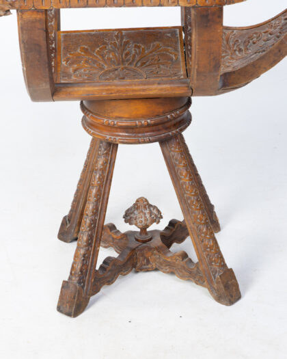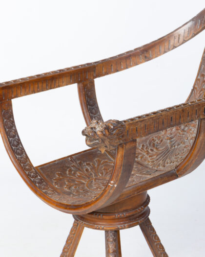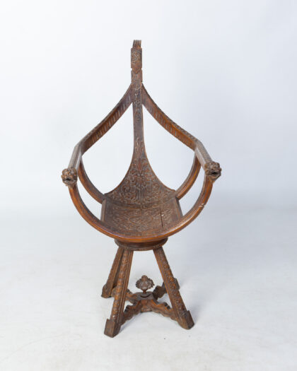 This vintage wooden swivel chair is a truly unique and eye-catching piece. The chair features intricate carving throughout, including floral motifs on the seat and base, and detailed lion head armrests. The chair swivels smoothly, offering both comfort and style. Constructed from solid wood. This chair is not only a functional piece of furniture but also a work of art. It would make a wonderful addition to any home, adding a touch of character and charm.
