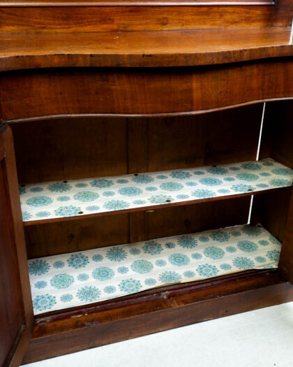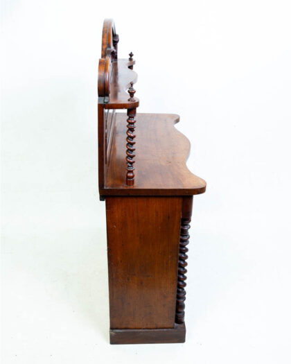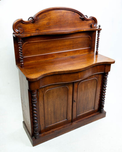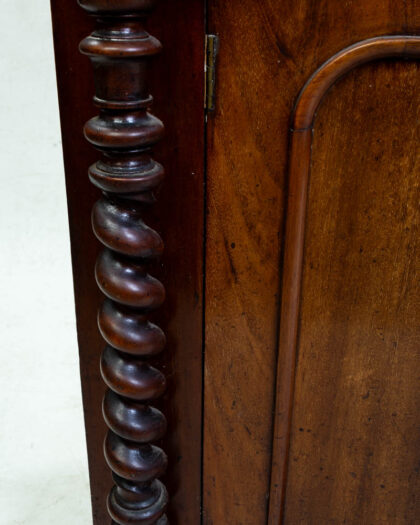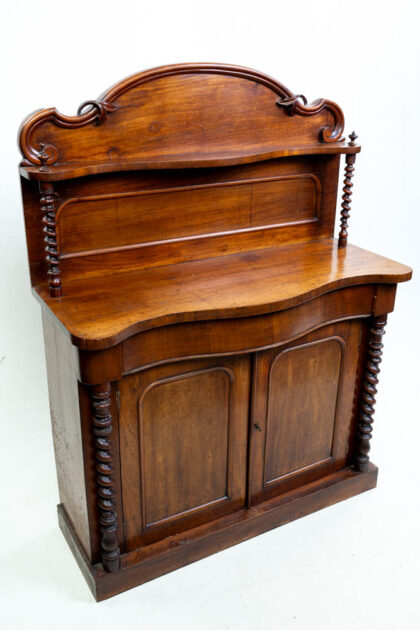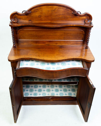 This is an antique Victorian mahogany washstand with shelf back. It features a shaped top above two cabinet doors. The interior of the cabinet is lined with a floral paper. The shelf at the back has carved detail with rope-turned uprights to either side. This beautiful antique washstand could be used in a variety of rooms in the house, from bathrooms to bedrooms.