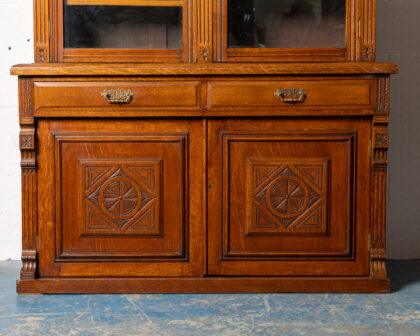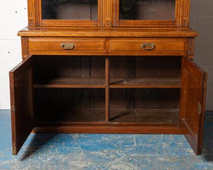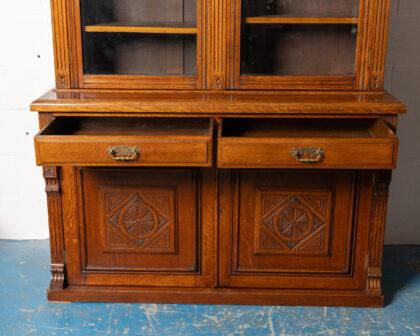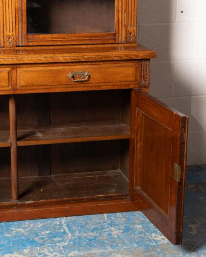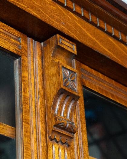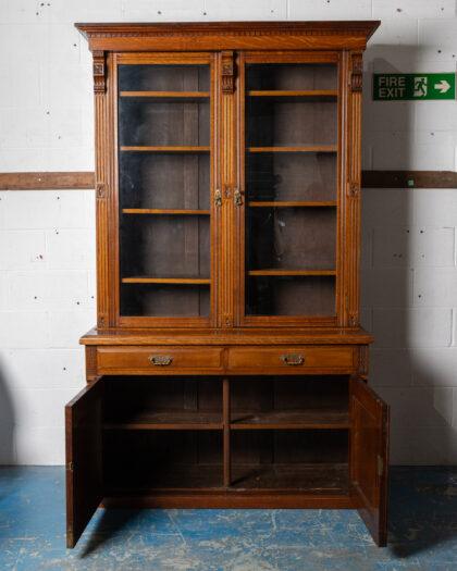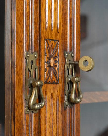 This exquisite Victorian oak bookcase features elegant glazed doors and three spacious shelves, perfect for displaying your treasured books and collectibles.