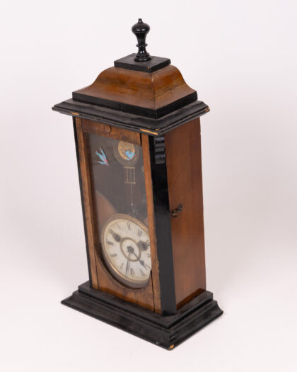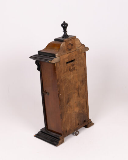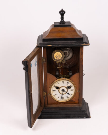 This antique wall clock features a wooden case with a dark brown and black finish. The clock face is cream with black Roman numerals. The clock has a pendulum movement visible through the glass. The overall condition is good, showing some signs of wear and age that add to its vintage charm. The clock has an opening door for access to the inner mechanics.