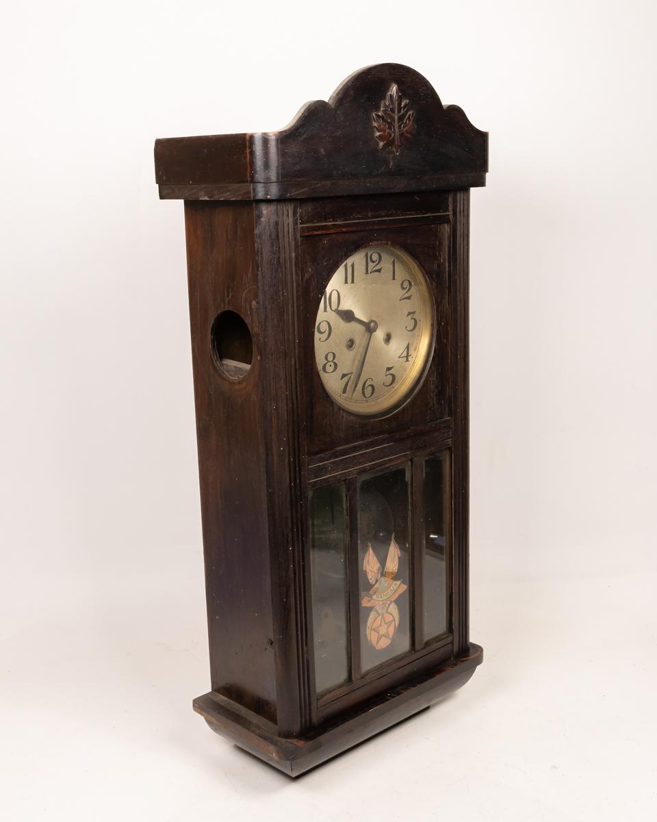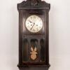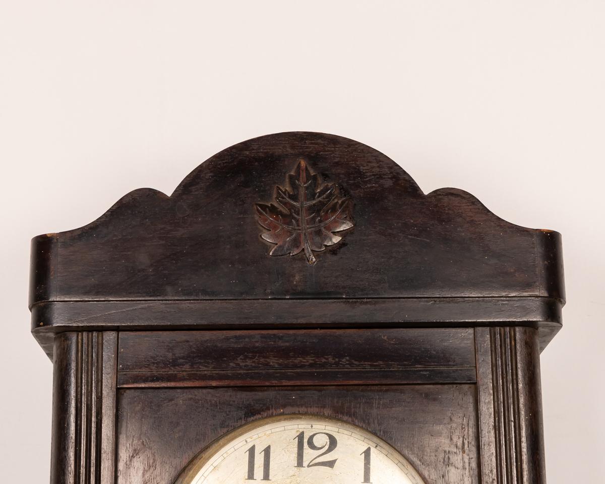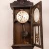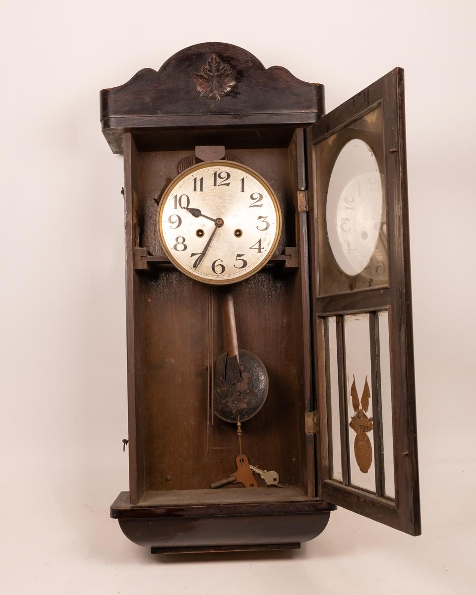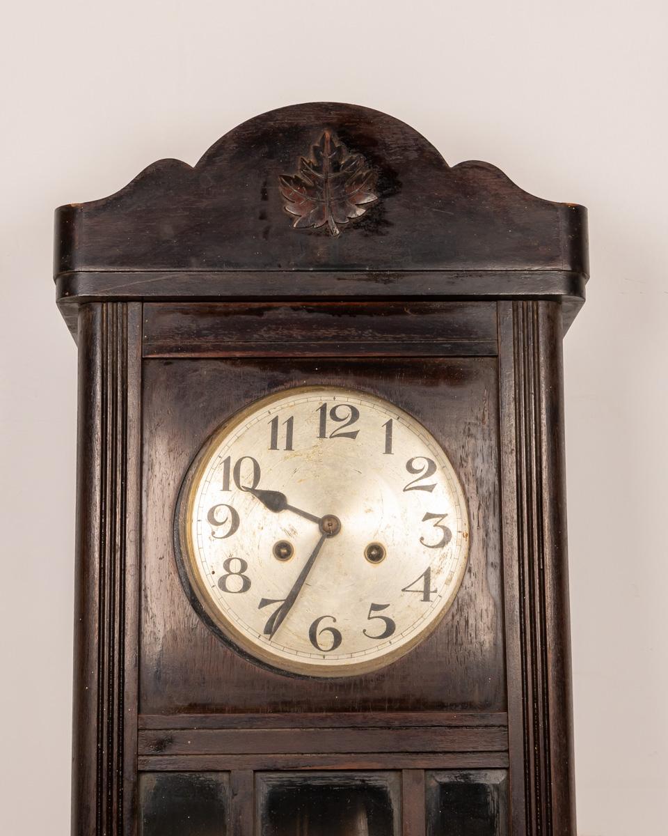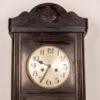 This antique wall clock features a beautifully crafted wooden case with a detailed carving on top. The clock face has classic numerals and delicate hands, adding to its vintage charm. The lower section includes a decorative glass panel with intricate design elements. Ideal for adding a touch of history and elegance to any room, the clock is in good condition with minor wear consistent with its age.