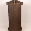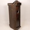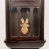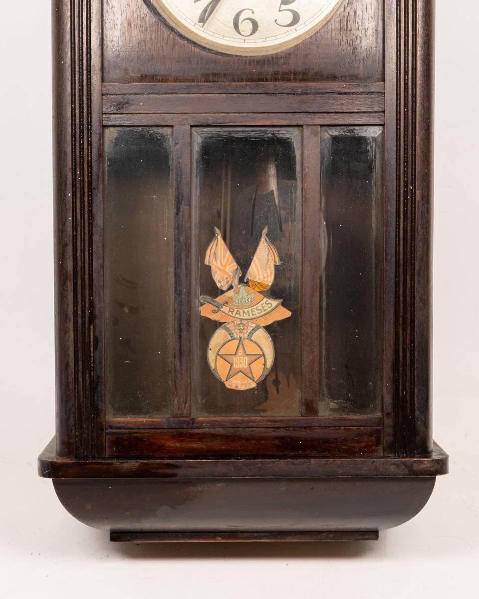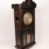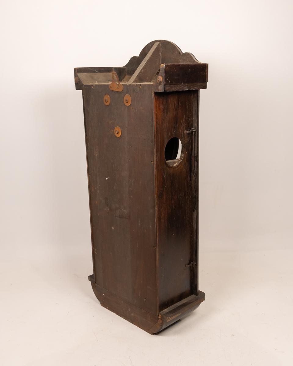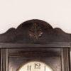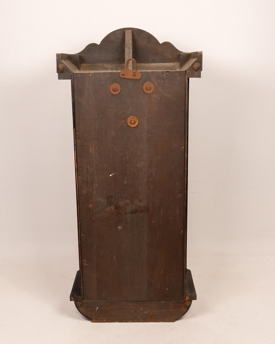 This antique wall clock features a beautifully crafted wooden case with a detailed carving on top. The clock face has classic numerals and delicate hands, adding to its vintage charm. The lower section includes a decorative glass panel with intricate design elements. Ideal for adding a touch of history and elegance to any room, the clock is in good condition with minor wear consistent with its age.