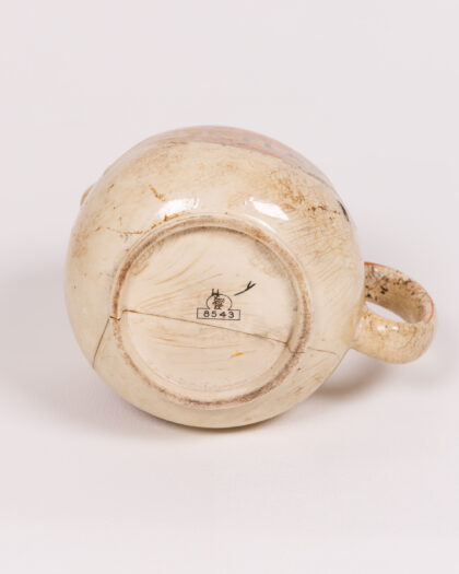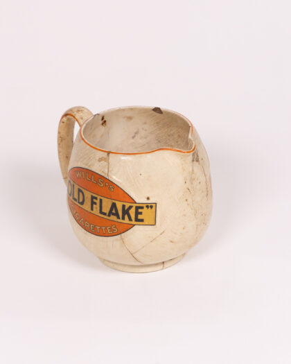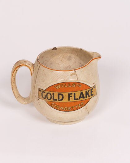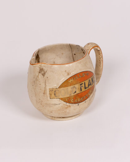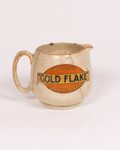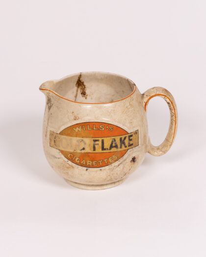 This is an antique Wills's Gold Flake Cigarettes advertising jug. The jug is made from ceramic and features the iconic Wills's Gold Flake logo in orange on a cream background. The jug has a handle and a spout for pouring. It would have been used to promote the Wills's Gold Flake cigarette brand, which was very popular in the UK during the 20th century. The jug has crazing throughout and some age-related discolouration. This wear adds to its charm and vintage appeal. The base has a stamped maker's mark and number.