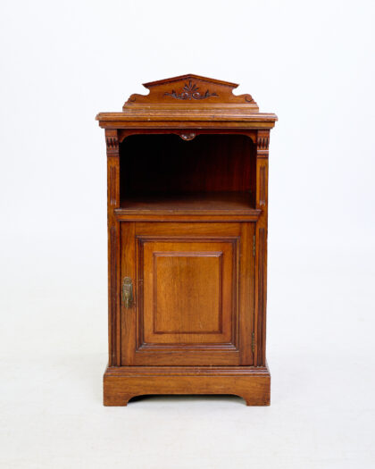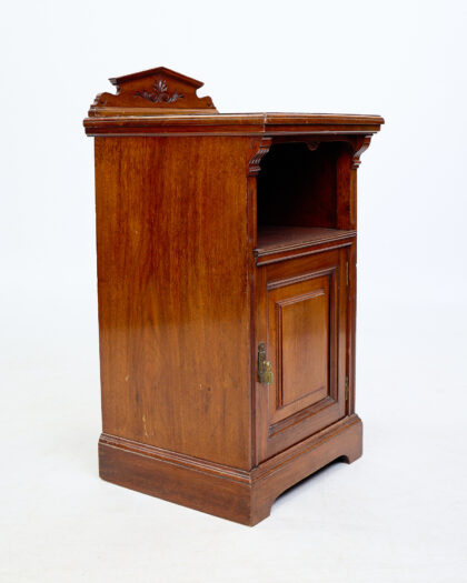 This is an antique wooden bedside cabinet. It features a small drawer at the top, followed by a small open shelf and then a small door with a brass handle, which opens to reveal shelving. The top of the cabinet has a decorative carved wooden detail. The wood is a rich brown colour and it has an aged patina, some wear and imperfections to the surface. This would suit a bedroom or living room.