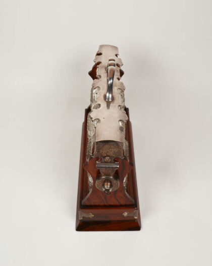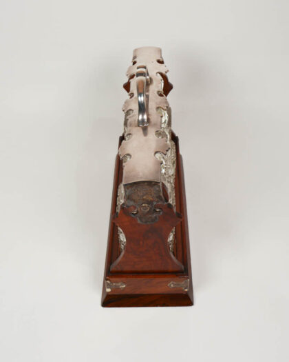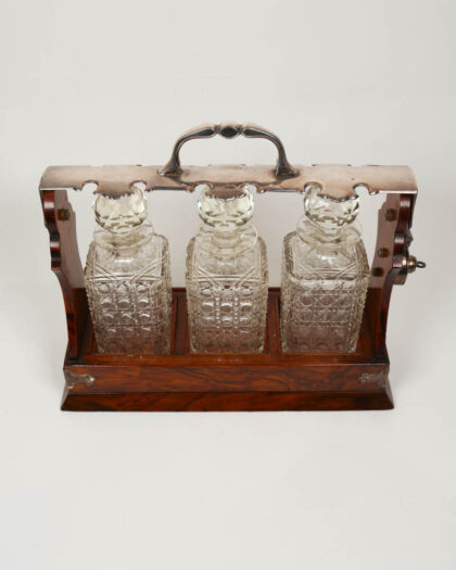Antique liquor decanter set featuring 3 glass decanters, a wooden base, and ornate silver plated mounts. The wood has a rich colour. Good condition for age.