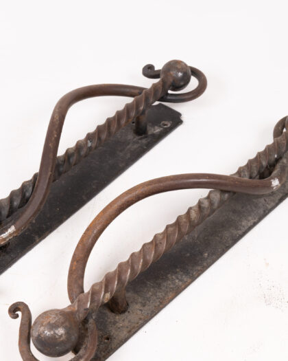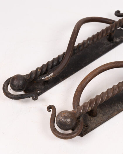A pair of characterful antique door handles crafted from wrought iron. The handles feature a twisted design with decorative ball ends, mounted on rectangular backplates. The ironwork shows signs of age and wear, including some surface rust, adding to their rustic charm. These handles would be ideal for adding a touch of period style to a home restoration project, or for adding an industrial-chic touch to modern interiors. Please note the handles are antique and display signs of use commensurate with their age.
