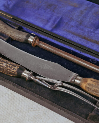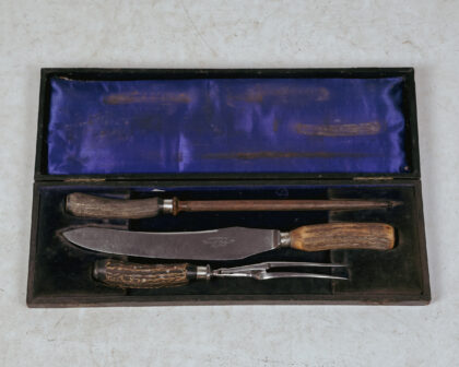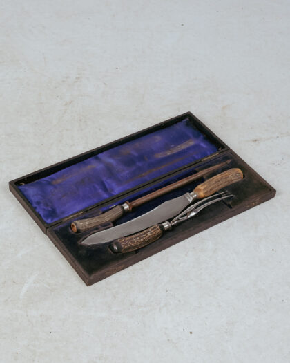 A boxed three piece carving set with antler handles made by Robert F. Mosley Ltd. Sheffield.