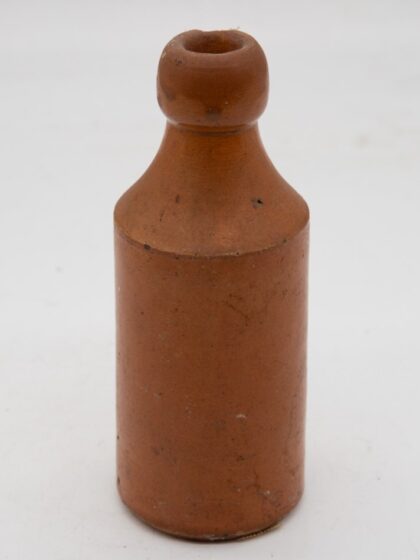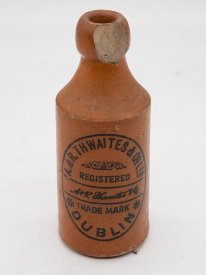 A brown glazed stoneware bottle for A. & R. Thwaites Dublin. Made by Price Bristol and bears impressed makers mark. There is a large chip to the lip.