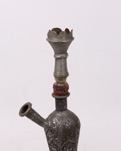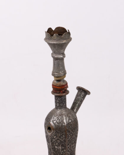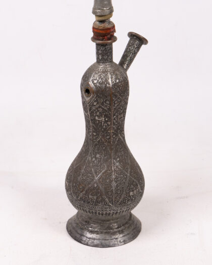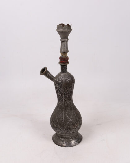 Ottoman metal hookah with engraved details. Silver/grey patina adds to its antique charm. Unique collectible for home display. Good condition.
