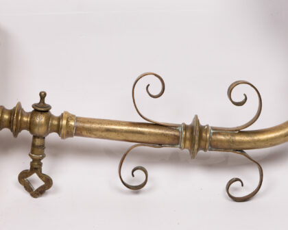 A stunning 1920s wall light featuring a brass fixture and a white glass shade, originally a gas light fitting, but it has been converted to electric.. The fixture is ornately designed with decorative swirls and a key detail. The light has an electrical plug. This item has not been tested, we cannot verify if it is working or not - please contact for more details.