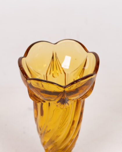 Vintage Sowerby amber glass vase. Featuring a swirl design and ruffled top edge, this Art Deco vase is an eye-catching decorative piece.