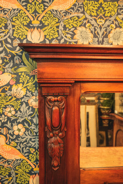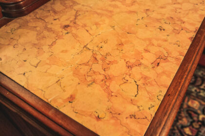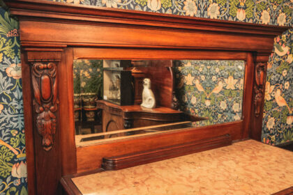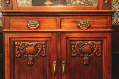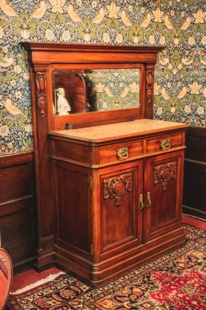 An art nouveau chiffonier / drinks cabinet / sideboard with decorative stone top and mirror back.