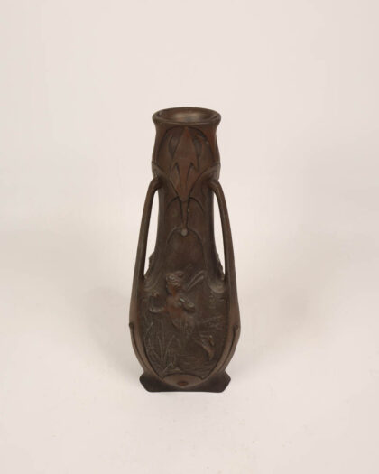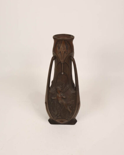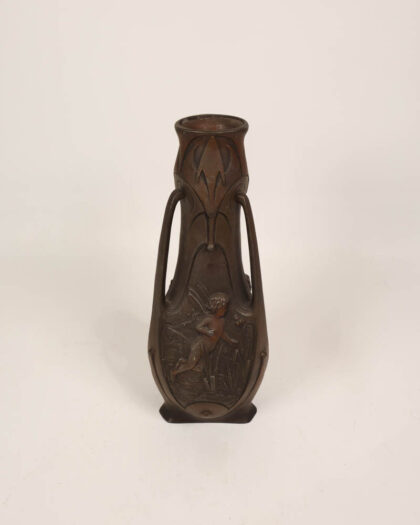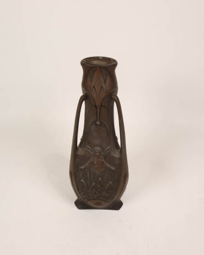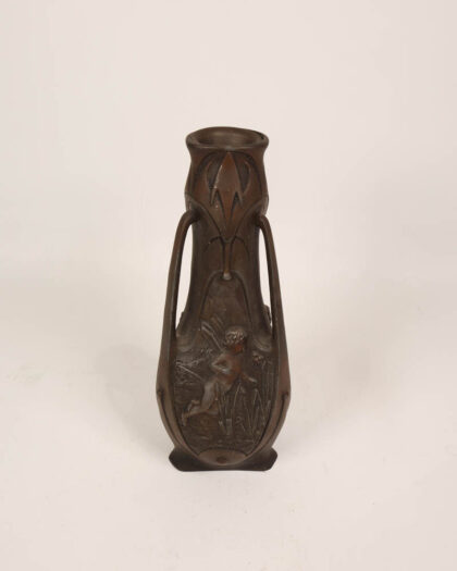 These are a pair of Art Nouveau style metal vases. The vases are decorated with embossed imagery including a fairy-like figure and floral designs. The vases have two handles on either side. The metal has a brown finish with a patina on the raised elements of the fairy. These vases would look great displayed on a mantelpiece or sideboard.