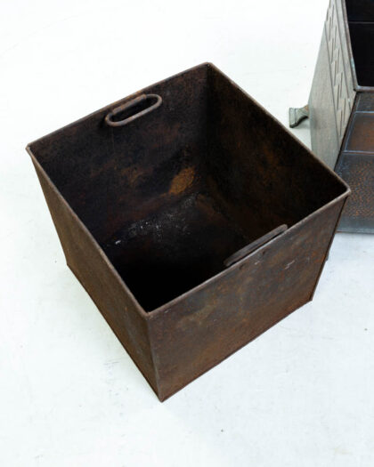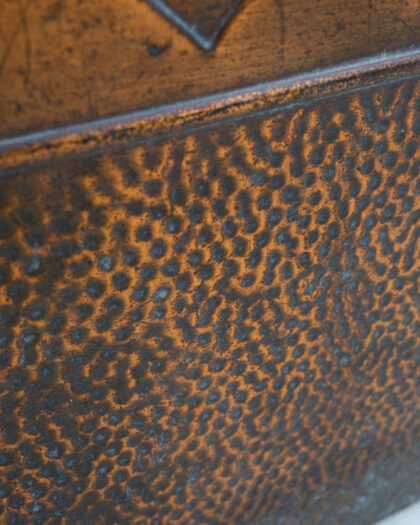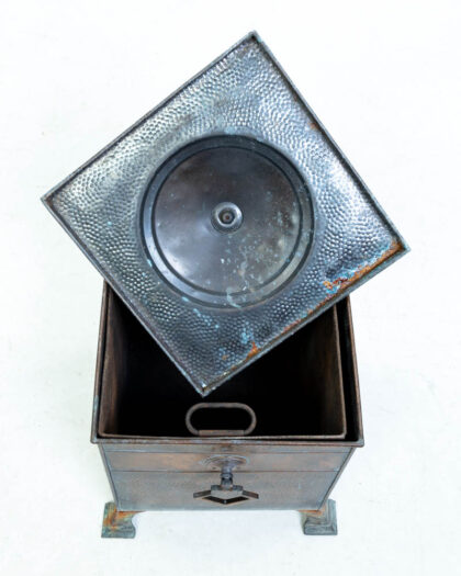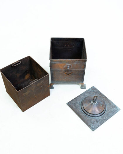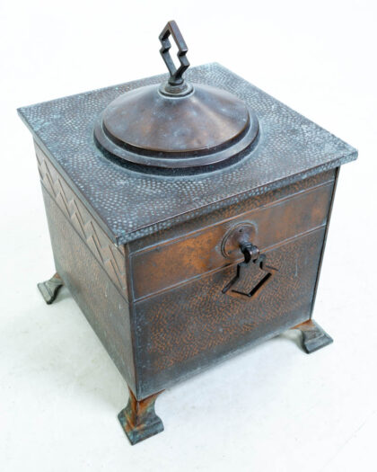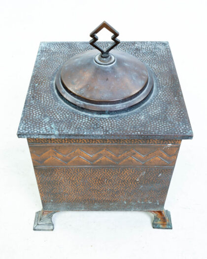 The bucket has a square shape with a lidded top, inner storage box, and decorative copper latch. The hammered texture adds visual interest and tactile appeal. The copper displays a rich brown colour with areas of green verdigris, indicating age and use. The square lid is topped with a domed lid and matching copper handle. The feet are square shaped, and give the container height. The inside of the box contains a lift out container with handles.