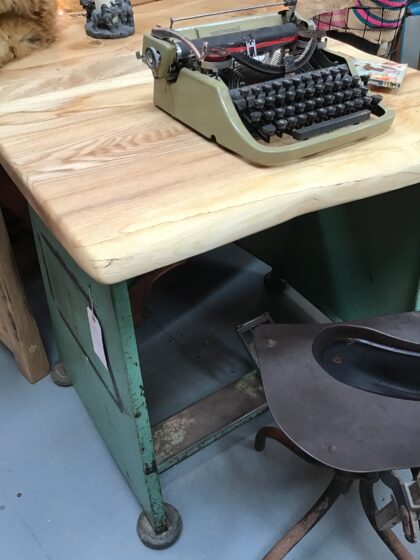 Made from what appears to have been an industrial sewing machine marked for Adamson. Top has been replaced with a solid slab of local ash hardwood, oiled for a natural finish.