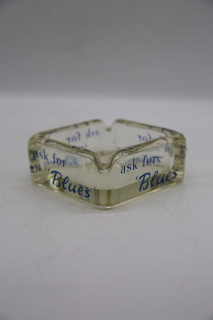 A square glass ashtray. Bears blue lettering which reads, “ask for ‘Blues'”.