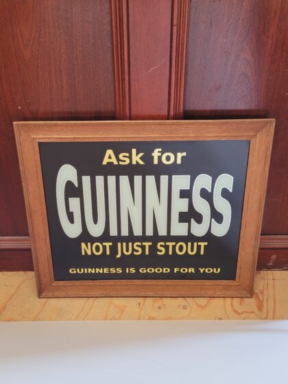 A framed advertising mirror. A local artist has produced this using 22ct gold and silver. Bears lettering which reads, "Ask for Guinness Not Just Stout Guinness is Good for You".