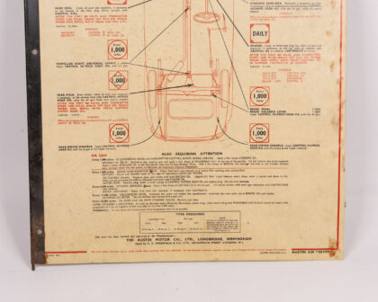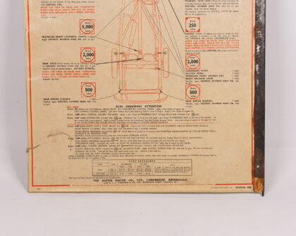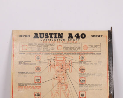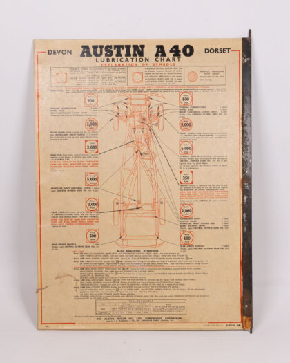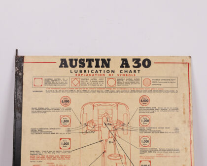 Vintage Austin A30/A40 lubrication chart. A classic garage sign with diagrams for car maintenance. Good condition, ideal for collectors.