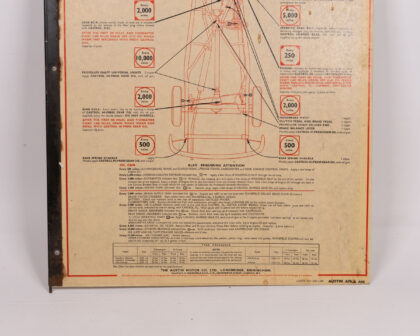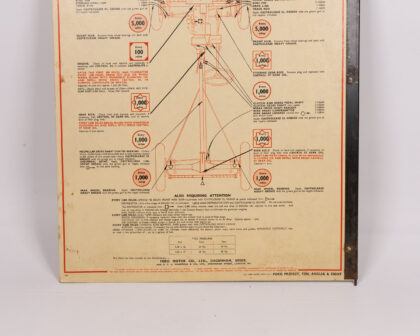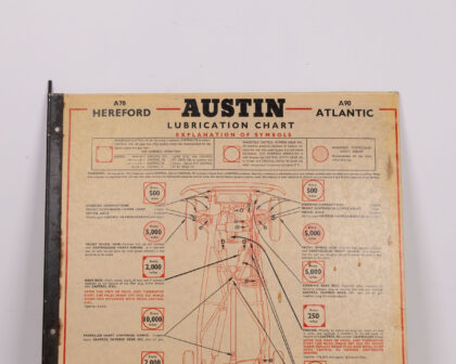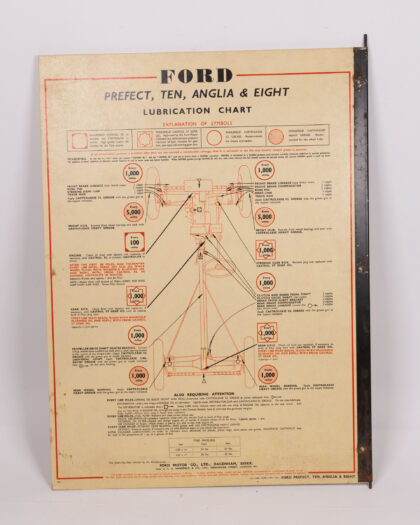 Vintage Austin & Ford lubrication chart. A classic garage sign with diagrams for car maintenance. Good condition, ideal for collectors.