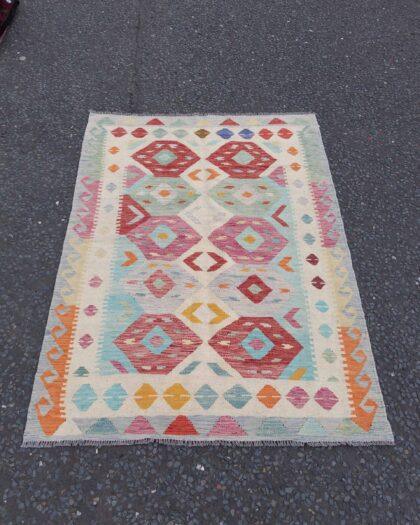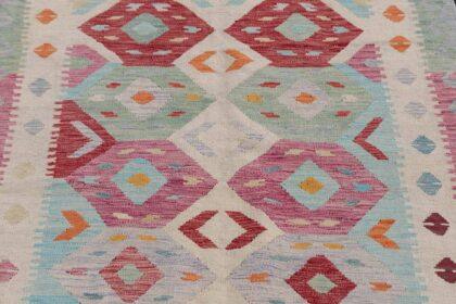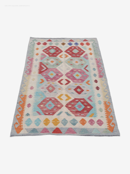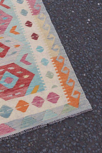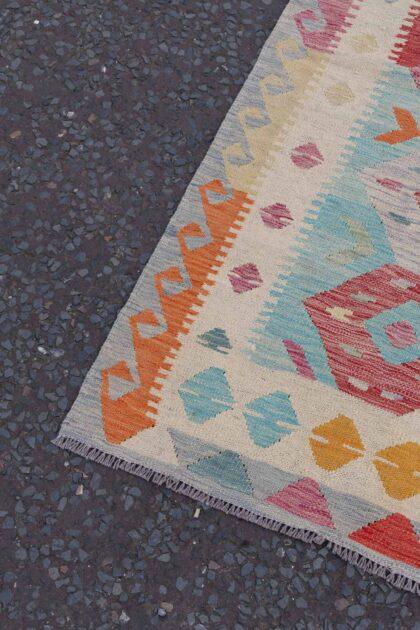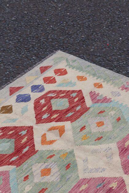 Discover the vibrant artistry of central Afghanistan with this authentic handwoven vegetable dyed Kilim rug.