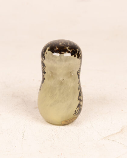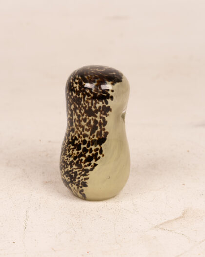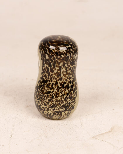 This is a decorative paperweight made from glass. It features an organic shape with a somewhat rounded top and a slightly narrower base. The glass is primarily a cream colour, adorned with irregularly shaped brown and black spots throughout, creating a mottled effect. There is a label on the bottom side of the paperweight. This item is ideal for adding a decorative touch to any desk or shelf. Would make a stylish home accessory. The condition of the glass appears to be good, with no obvious chips or cracks.