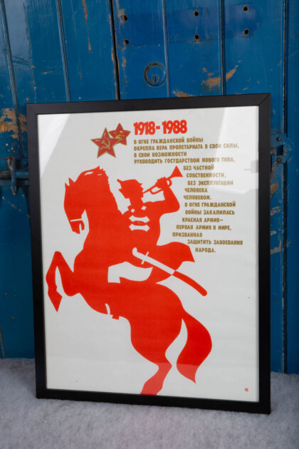 Roughly translates to "1918-1988 In the Fire of the Civil War, the Proletariat's Faith in its Powers, in its Possibilities to Lead the State of a New Type, Without Private Property, Without the Exploitation of Man by Man, has been Strengthened. The Red Army, the First Army in the World, Designed to Defend the Conquests of the People, has been Tempered in the Fire of the Civil War".