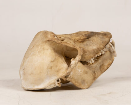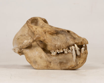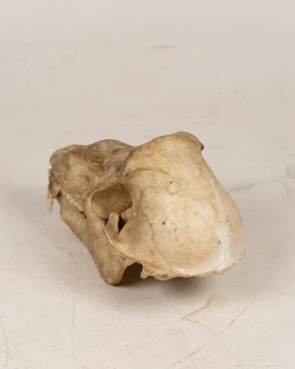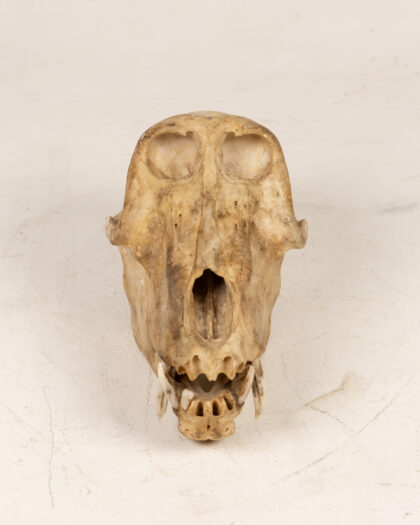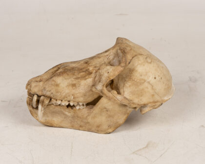 A natural bone baboon skull, perfect for taxidermy enthusiasts and collectors. The skull showcases intricate details of the bone structure. It is in good condition, with natural imperfections adding to its character and authenticity. It has a natural bone finish. The item is ideal for educational purposes, scientific study, or as a unique decorative piece. The skull has prominent canine teeth. It has some staining and minor wear.