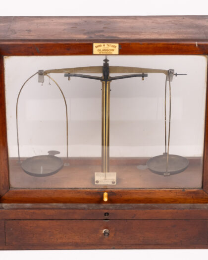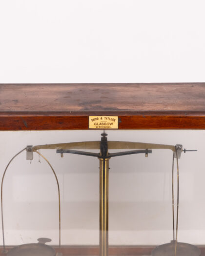 This is a vintage balance scale housed within a wooden and glass case. The manufacturer's name is visible on the top part of the unit, reading 'Baird & Tatlock, Glasgow.' It features a drawer at the bottom with a brass knob. Inside the case are two metal weighing plates suspended by wires from a central balance mechanism. The case is constructed from dark wood with a glass front, sides, and top, allowing the balance to be viewed from all angles. It is suitable for display.