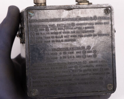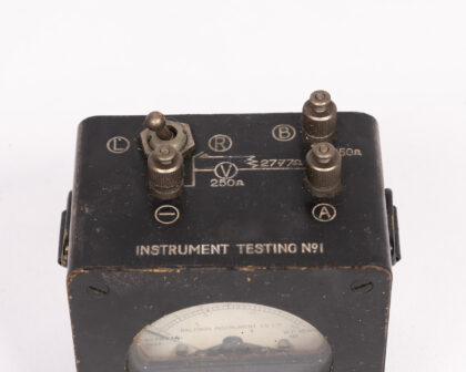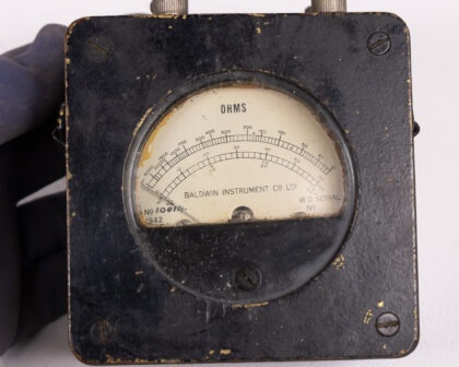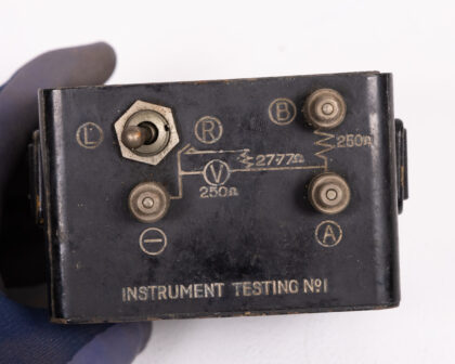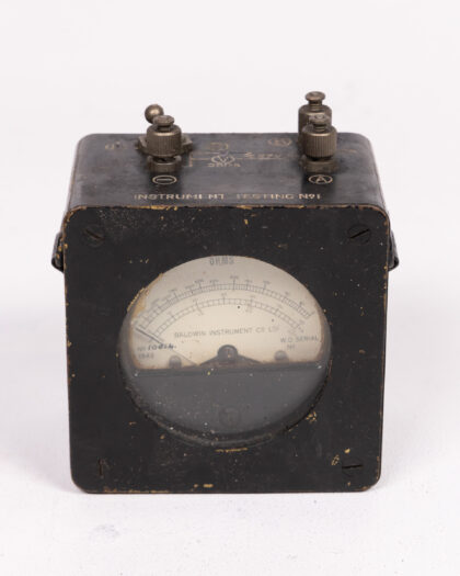Vintage Baldwin Instrument Testing No1, dating to 1942. A piece of scientific history, this device features a clear OHMS meter, various terminals (L, R, B, A), and detailed testing instructions on the back. The unit shows signs of age with some cosmetic wear but remains a fascinating display piece. Untested. A great addition to any collection of scientific instruments. Perfect for display.