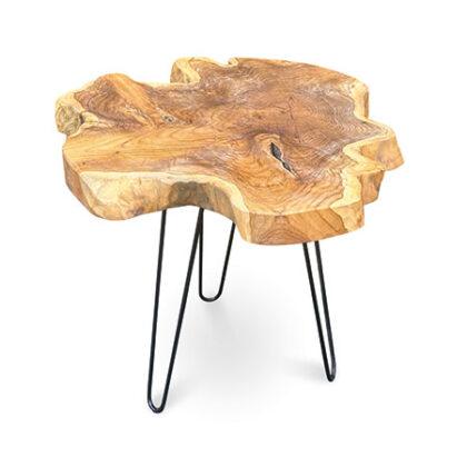 A unique side table made from slice of teak root, hand carved into a table top by Indonesian artists. Held up with 3 sturdy metal legs for a more industrial look.