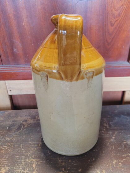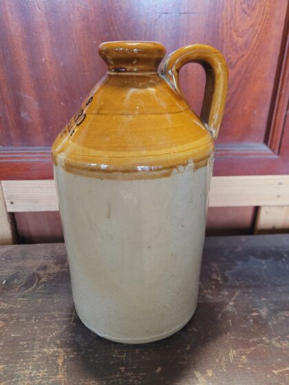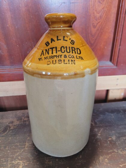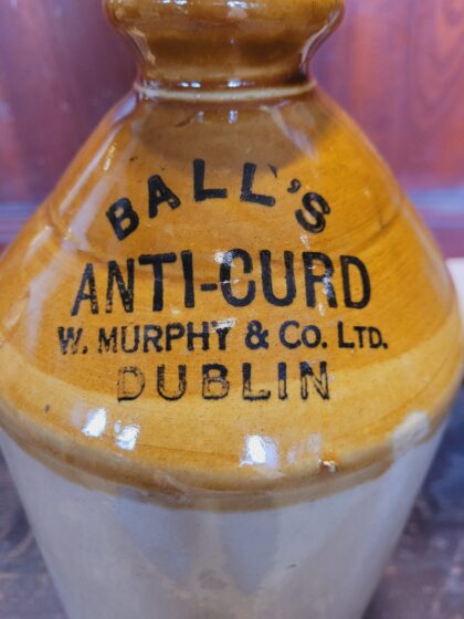 A brown two tone glazed stoneware flagon. Bears black lettering which reads, "Ball's Anti-Curd W. Murphy & Co. Ltd. Dublin". Bears black lettering to base which reads, "Container made in England".