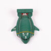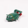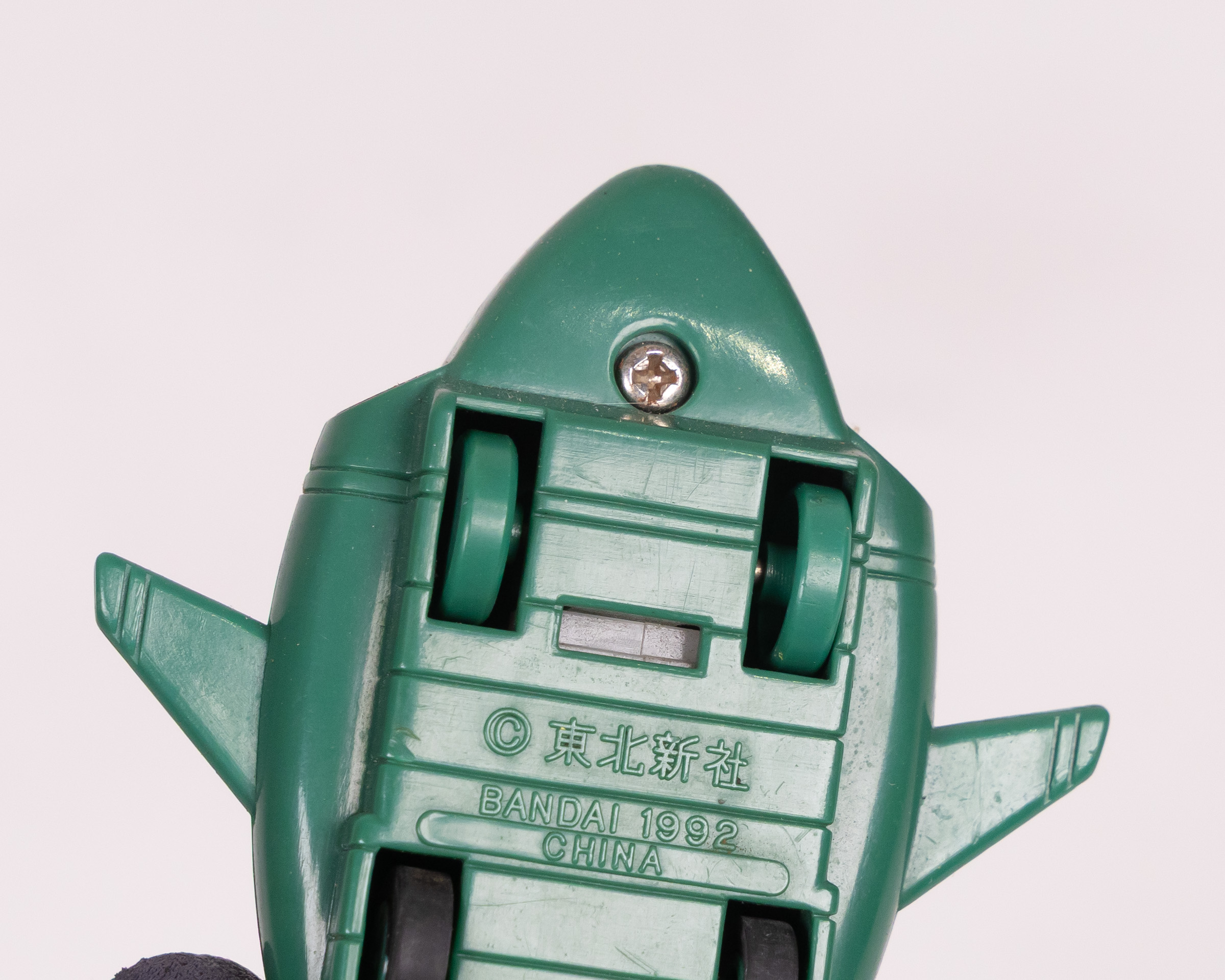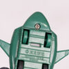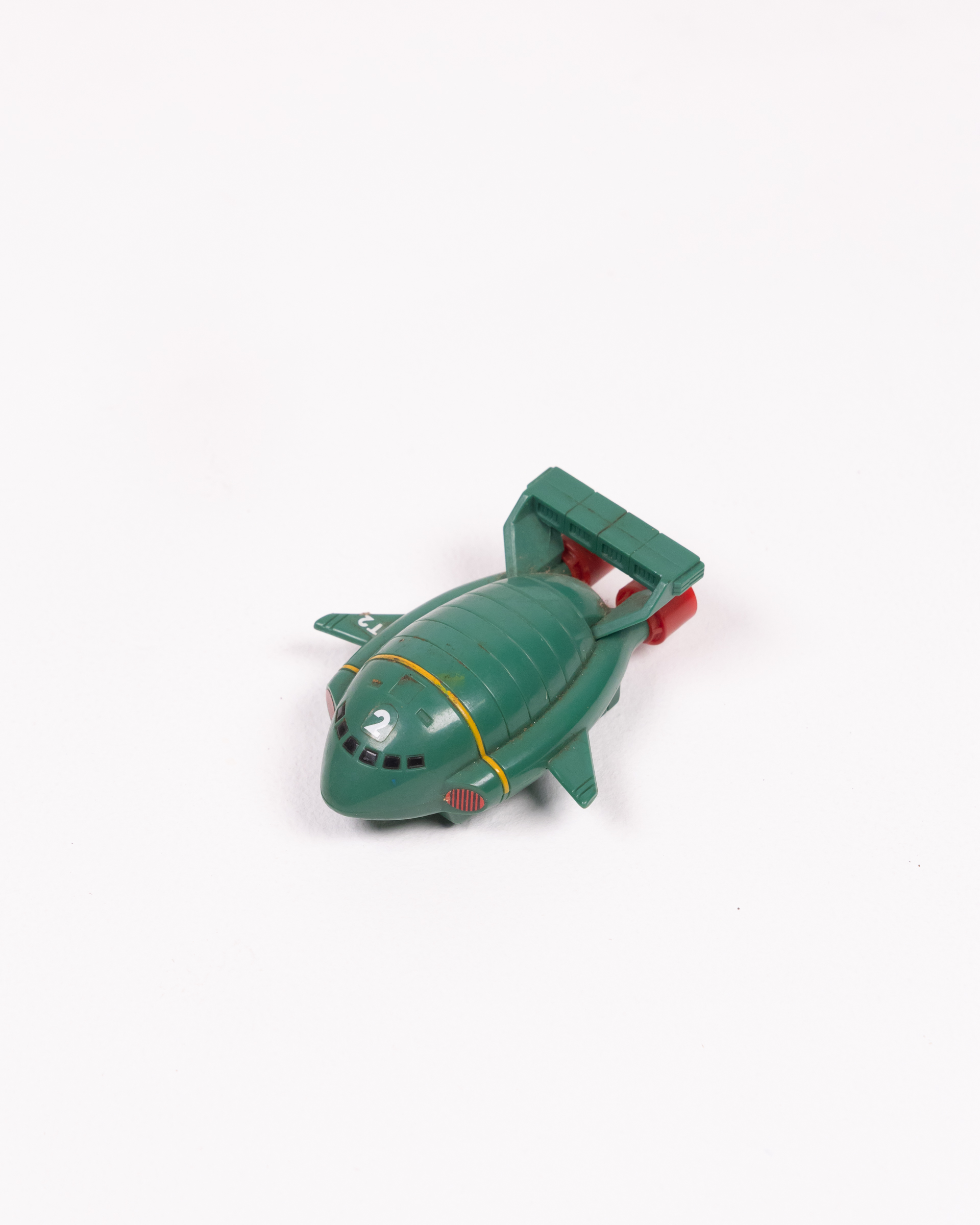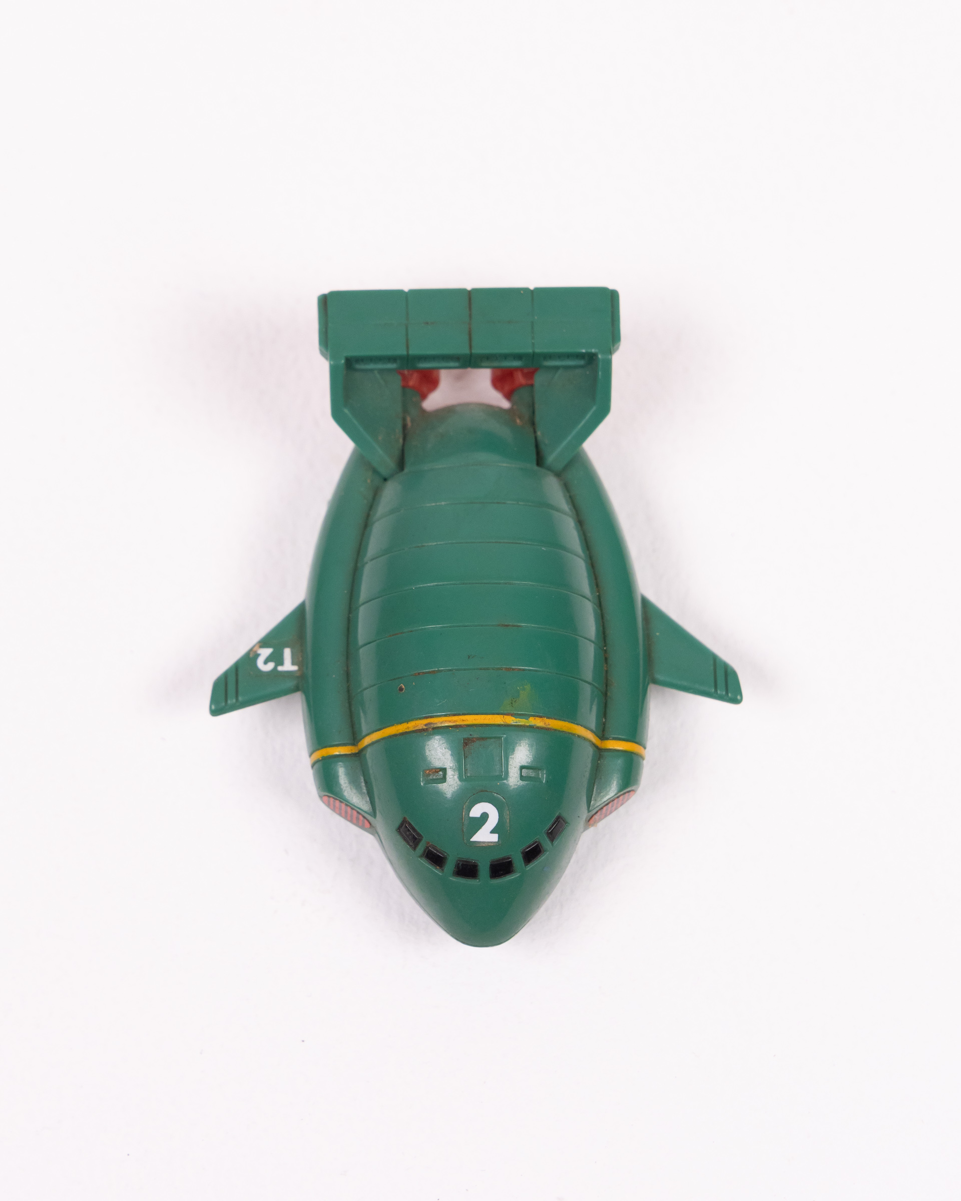 Vintage Bandai 1992 Thunderbirds 2 plastic vehicle toy. Made from green plastic, with red thrusters and yellow stripe detailing. “T2” is printed on the wings and “2” on the top of the vehicle. The base has small wheels so it can be rolled along. The base is also marked “Bandai 1992 China”. Some signs of wear consistent with age, including some surface marks. Overall, it is in good condition.