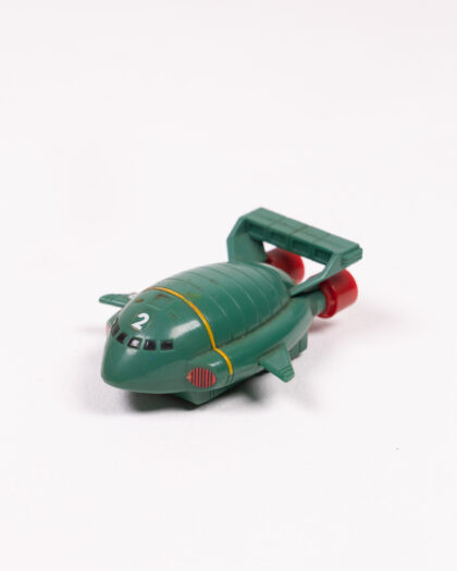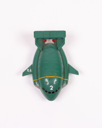 Vintage Bandai 1992 Thunderbirds 2 plastic vehicle toy. Made from green plastic, with red thrusters and yellow stripe detailing. "T2" is printed on the wings and "2" on the top of the vehicle. The base has small wheels so it can be rolled along. The base is also marked "Bandai 1992 China". Some signs of wear consistent with age, including some surface marks. Overall, it is in good condition.