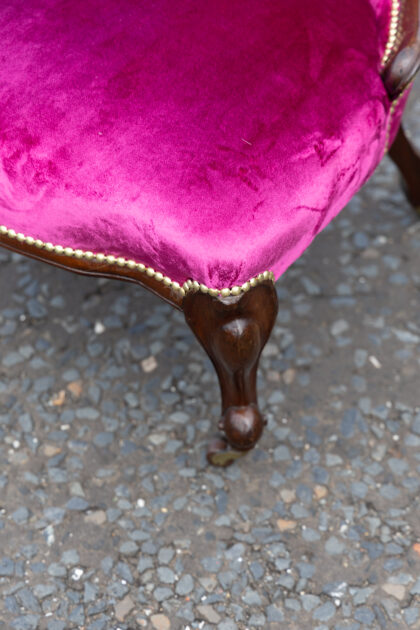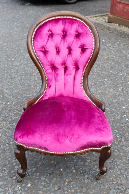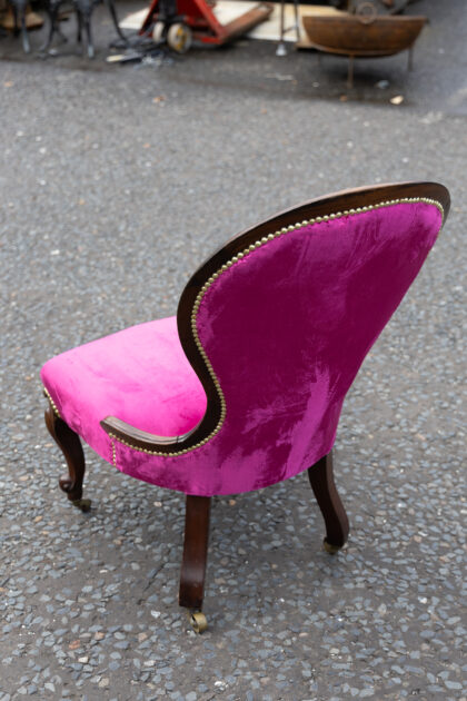 Reupholstered in shimmering bubblegum-pink fabric, this neat little Victorian lounge chair is good for another very stylish generation of enjoyment.
