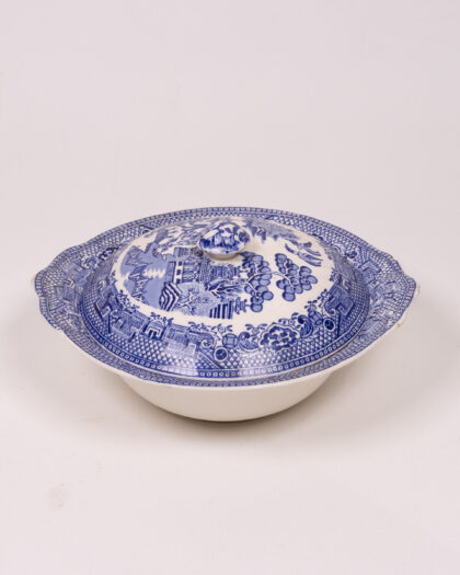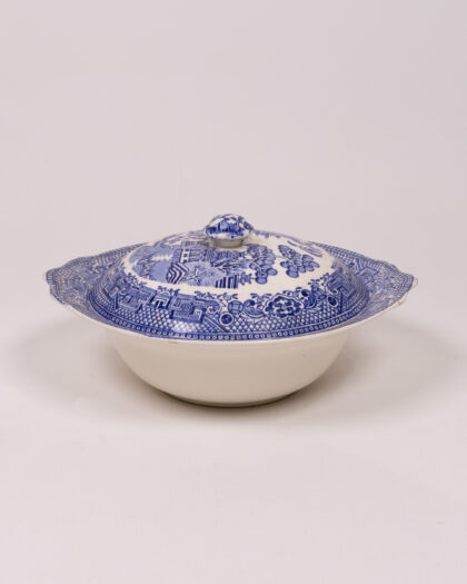 Vintage Barratts Staffordshire England bowl with lid. The bowl features the classic blue and white Willow pattern. Very good condition.