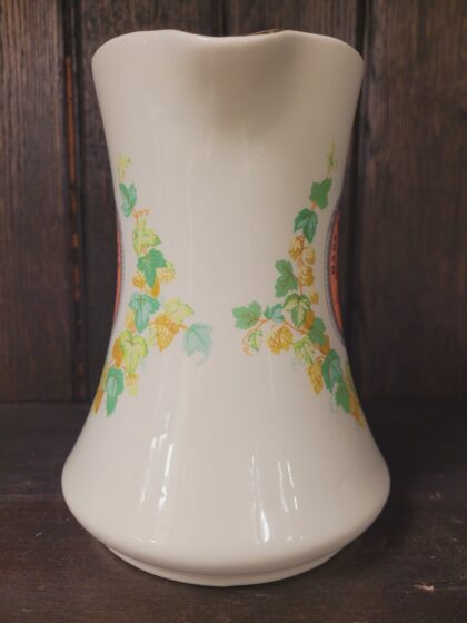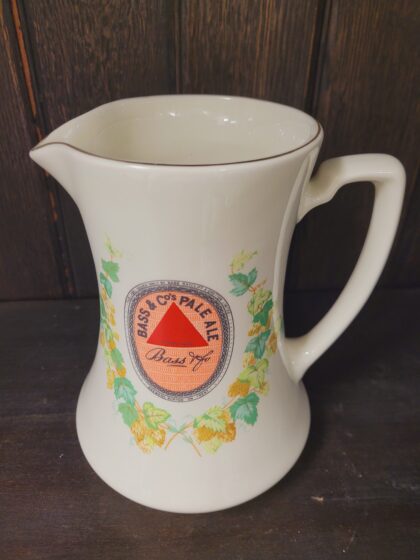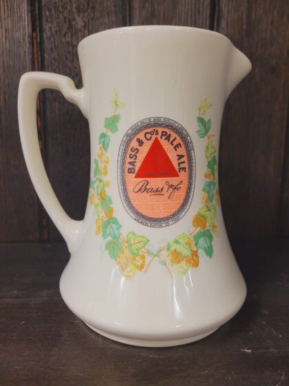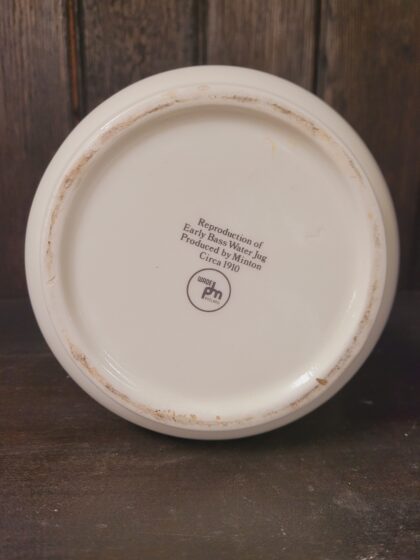 A white glazed ceramic bartop water jug for Bass & Co's Pale Ale. Made by Wade and bears black backstamp to base. Bears black lettering to base which reads, "Reproduction of Early Bass Water Jug Produced by Minton Circa 1910".