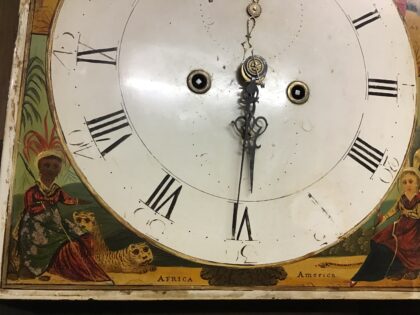 Fabulous grandfather clock. Beautiful hand-painted detail in clock face with ideological Representations of Four continents in the four corners. Britain Represented at the top. Glass fronted cover case. Approx 200cm tall, 48cm wide, 23cm wide, Clock body inlaid with marquetry.