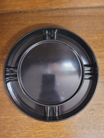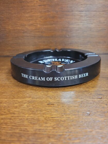 A black bakelite plastic circular ashtray. Bears white, black and gilt lettering which reads, "Belhaven Est. 1719 Original Best A Beautifully Balanced Honey Coloured Beer The Cream of Scottish Beer."