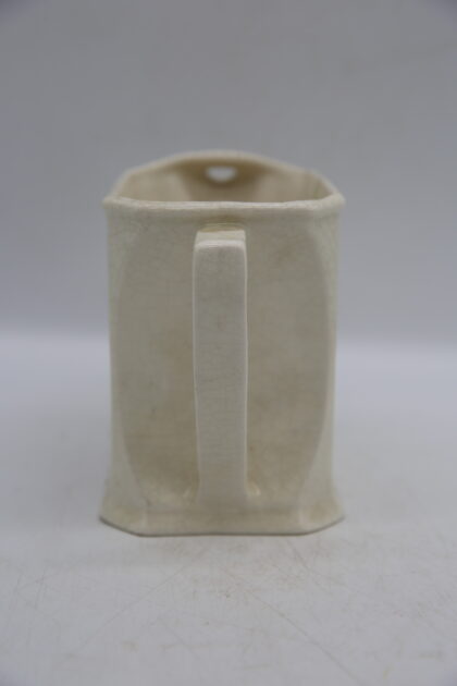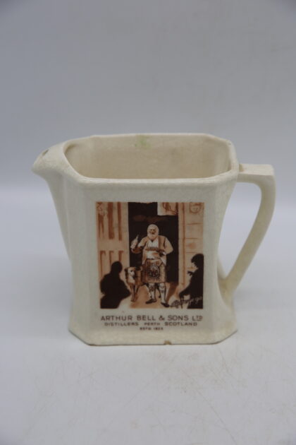 A white glazed ceramic bartop water jug. Bears brown lettering which reads, "Bell's Scotch Whisky "Afore ye go" Arthur Bell & Sons Ltd. Distillers Perth Scotland Estd. 1825". Bears two backstamps to base - a green Argyll Pottery backstamp and a brown Hancock Corfield & Waller Ltd Mitcham backstamp.