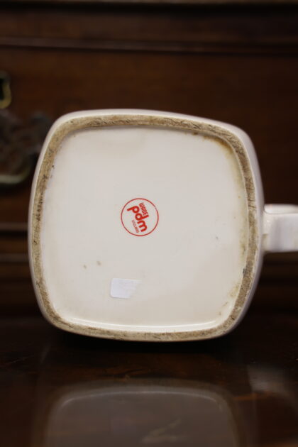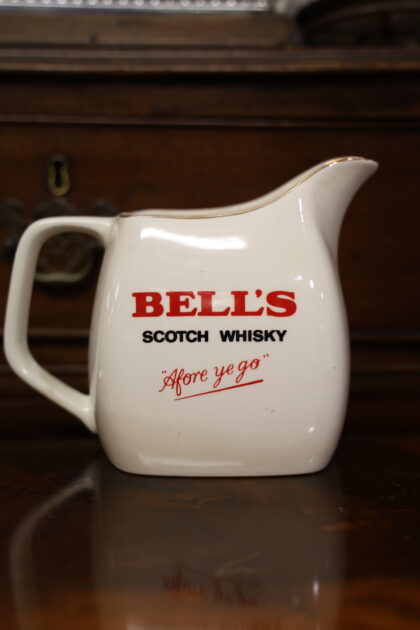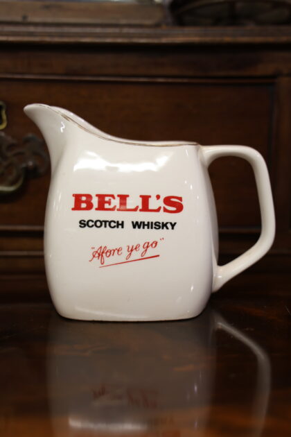 A white ceramic jug with red and black lettering which reads, "Bell's Scotch Whisky "Afore ye go"". Made by Wade and bears red backstamp to base.